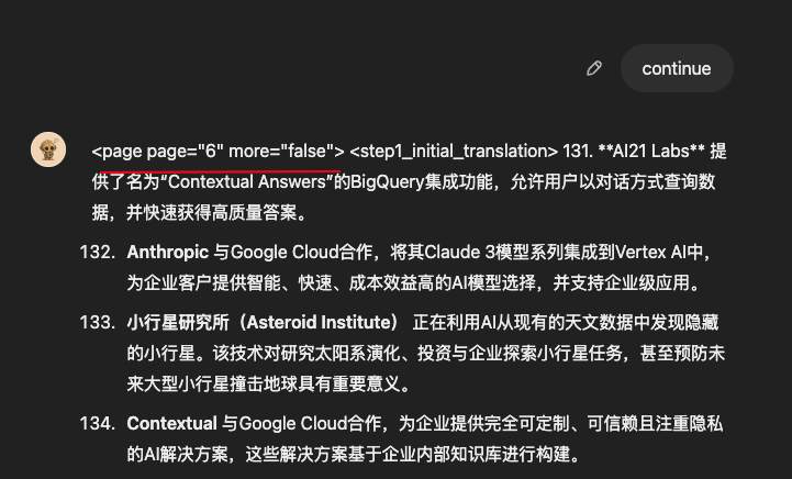 初步测试了一下看来是可行的。一篇很长的文章 https://blog.google/products/google-cloud/gen-ai-business-use-cases 也可以在 6 次 continue 后完成。